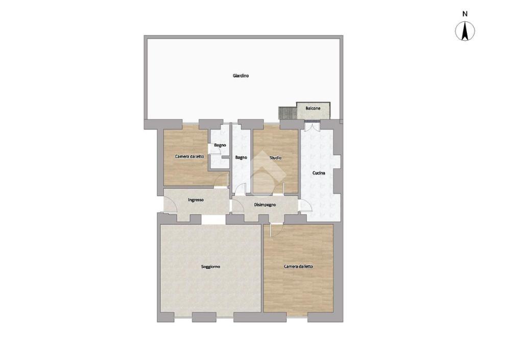 Si presenta internamente in buone condizioni e, nello stato attuale, è organizzato in modo ottimale grazie al comodo ingresso e ai disimpegni, che accolgono armadiatura a muro su misura e conducono a tutti gli ambienti: una zona giorno di 35 mq, due camere da letto, di cui una con bagno en suite, uno studio, una cucina abitabile e un secondo bagno.
